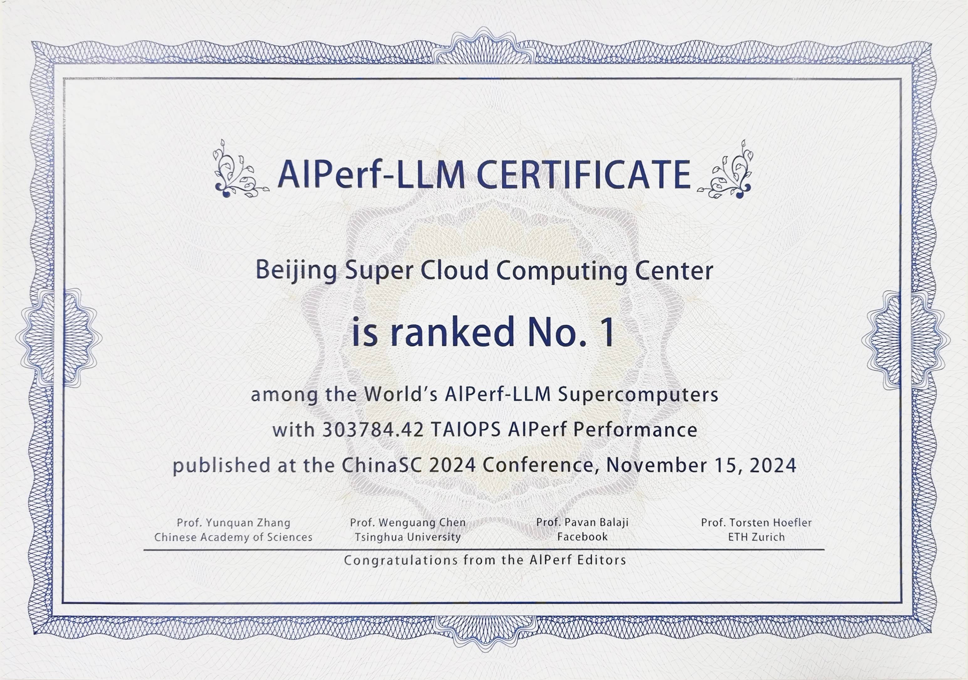 在智算方面,北京超算也收獲頗豐。北京超算N76H8分區高性能計算機在“2024年世界人工智能算力性能AIPERF500排行榜”中位居AIPerf-LLM大模型訓練算力性能榜第一名;N76H8分區單機則奪得AIPerf-Inference AI推理延遲性能榜第一名。