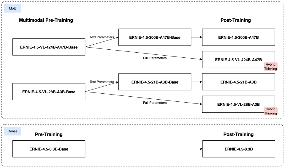 此次文心4.5系列開源模型共10款,涵蓋了激活參數規模分別為47B和3B的混合專家(MoE)模型(最大的模型總參數量為424B),以及0.3B的稠密參數模型。